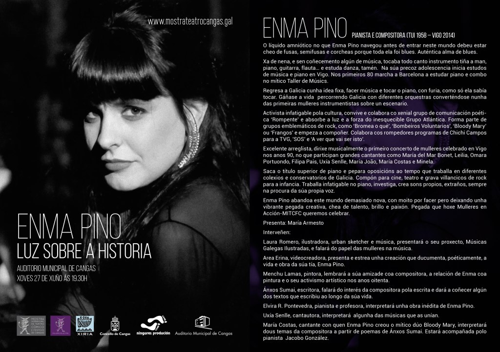 Gracias á XXXVI Mostra Internacional de Teatro Cómico e Festivo de Cangas por invitarme a abrir o acto das xornadas do xoves, día 27 de xuño, Mulleres en Acción. Nesta ocasión foi dedicada á pianista Enma Pino, e que contou coas actuacións de Uxía, María Costas e Elvira R. Pontevedra, e coa participación da pintora Menchu Lamas, a escritora Anxos Sumai. Rematou coa proxección dun documental de Area Erina sobre a pianista.